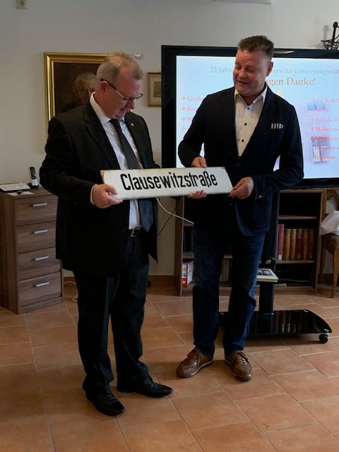 Den geschichtsinteressierten Gästen wollten wir, der Leiter der Erinnerungsstätte in Zusammenarbeit mit dem Freundeskreis Carl von Clausewitz, zwei sehr interessante Objekte zum Jubiläum präsentieren. Das ist uns hervorragend gelungen. Man sagt doch- alle guten Dinge sind drei – ja es wurden wirklich drei Exponate mit einer besonderen Strahlkraft. Markus Kurze überreichte Dr. Rolf -Reiner Zube das 120 Jahre alte Straßenschild „Clausewitzstraße“ (das erste) als Dauerleihgabe. Auf dieses zeitgenössische Straßenschild werde ich noch im weiteren Verlauf eingehen. Wir präsentierten unseren Besuchern und Gästen zum 25-jährigen Jubiläum: