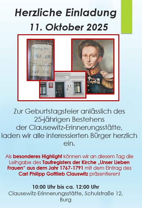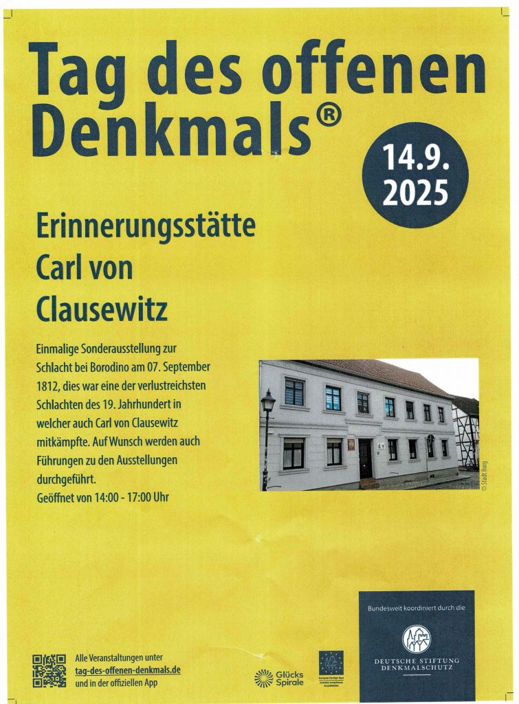 Am 14.09.2025 ist die Erinnerungsstätte anlässlich des „Tag des offenen Denkmals“ von 14:00 bis 17:00 Uhr geöffnet. Die Besucher erwartet am 14.09.25 eine einmalige Sonderausstellung zur Schlacht bei Borodino, an welcher auch Carl von Clausewitz aktiv beteiligt war sowie eine Überraschung. Natürlich kann man sich auch wie gewohnt die Ausstellung ansehen!